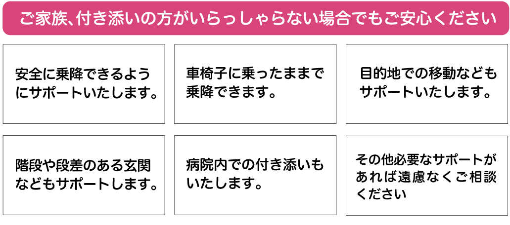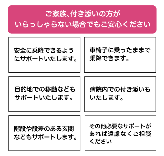 ご家族や付き添いの方もご一緒に乗車いただけますので、ご安心ください。