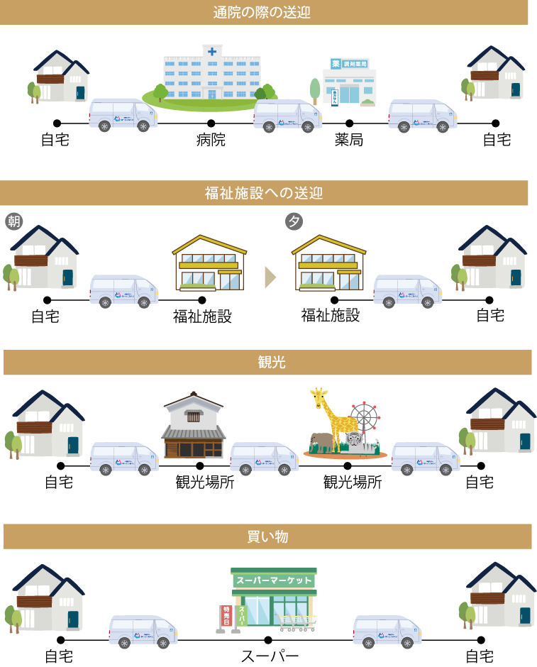通院や施設の送迎はもちろん、冠婚葬祭や外出時もご家族そろっての移動をサポートいたします。